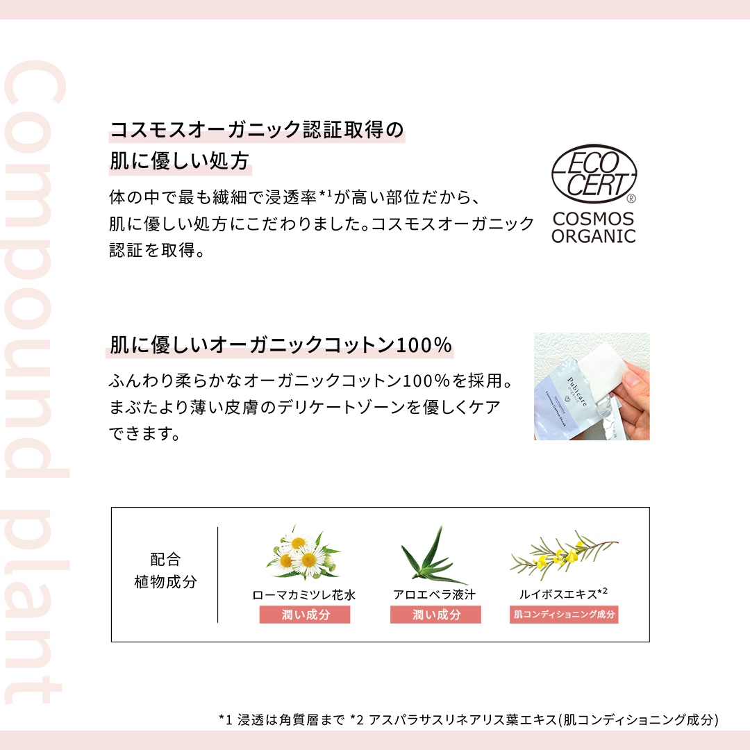 ふんわり柔らかなオーガニックコットン100%を採用。まぶたより薄い皮膚のデリケートゾーンを優しくケアできます。
